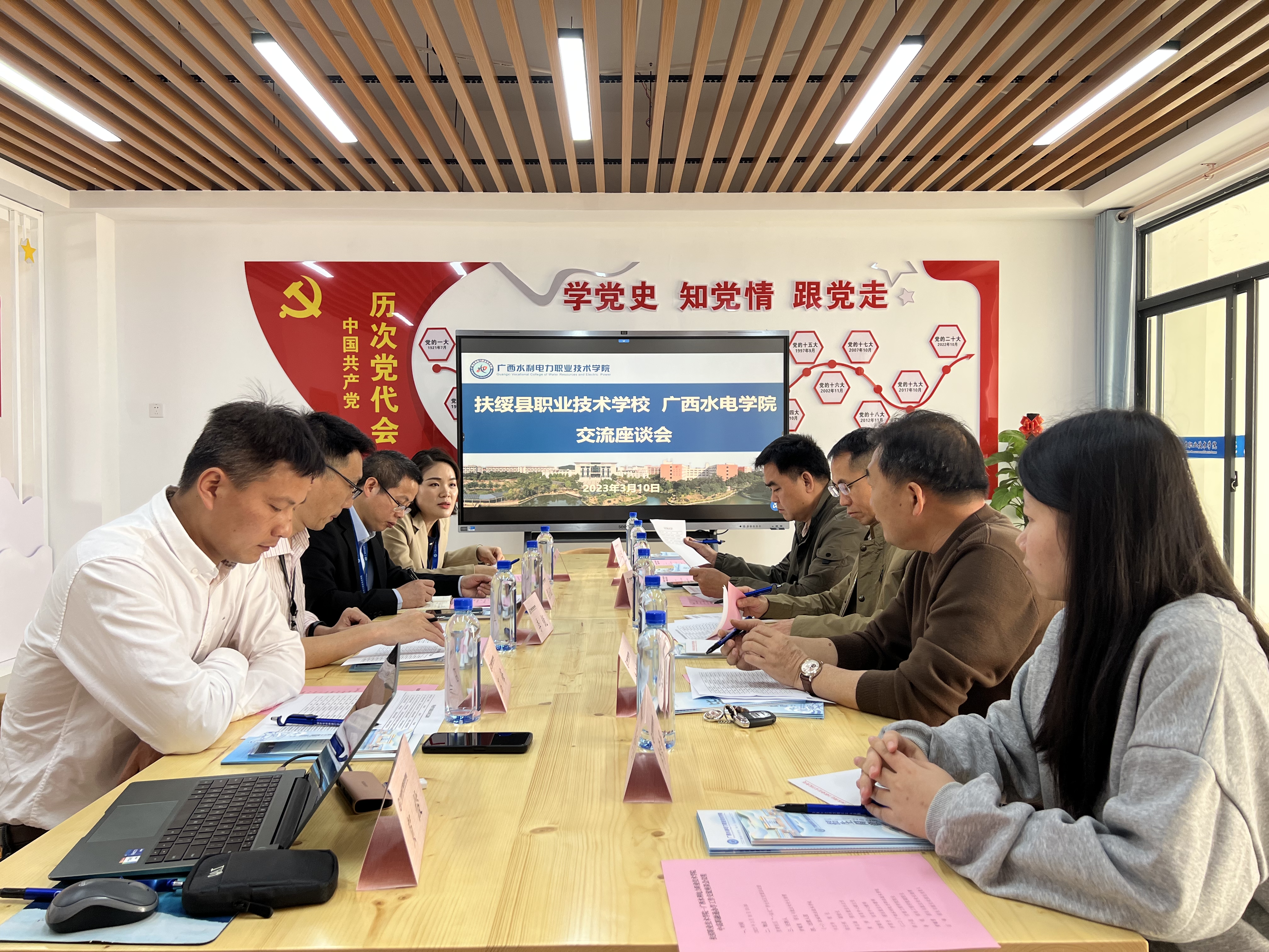 3月10日,扶绥县职业技术学校吴树新副校长、陆仕积副校长、李志海招生就业办主任一行到pp电子就中高职衔接培养教学工作进行交流座谈,pp电子交通工程学院院长梁小流、机电工程学院副院长季锐、招生与就业处处长助理黄曦慧及招生与就业处相关人员参加了活动。