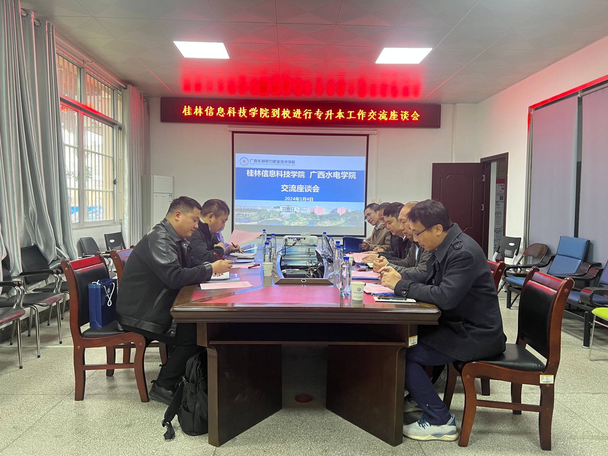 1月4日上午,桂林信息科技学院校长助理彭鹏一行三人莅临学校长堽校区就专升本工作开展交流座谈会。学校招生与就业处处长、水利工程学院、电力工程学院、机电工程学院、自动化工程学院负责人参加交流活动。
