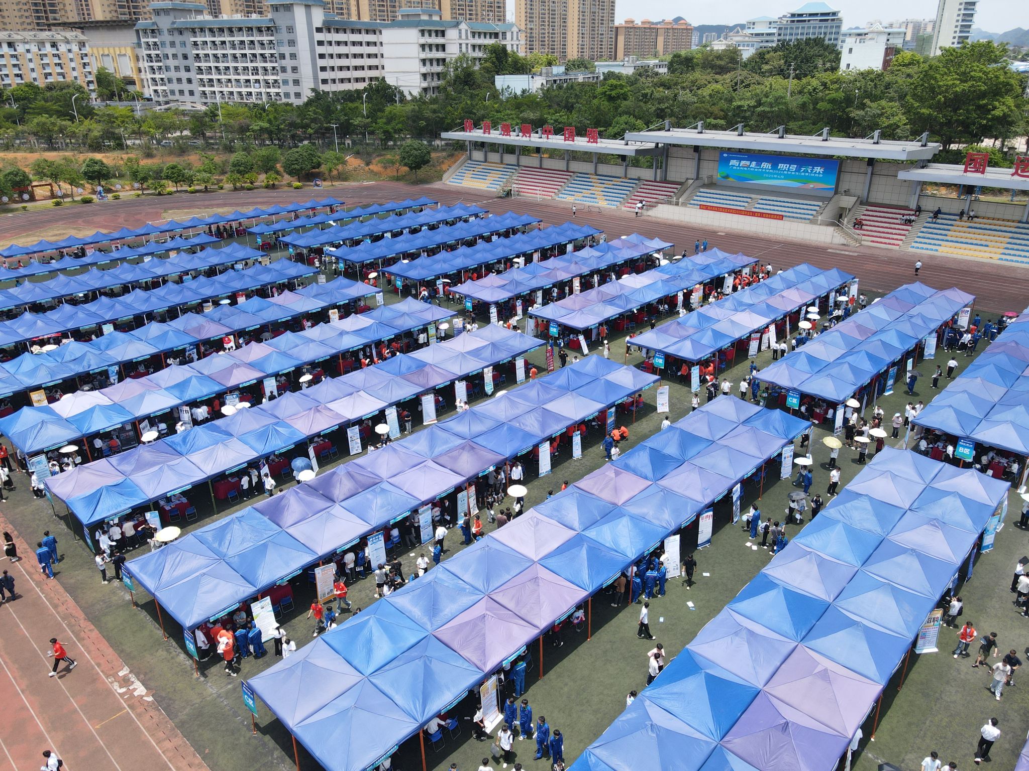 [本网讯]6月6日上午,学校“青春起航 职引未来”2026届毕业生(夏季)双选会在里建校区足球场开启。来自全国超过400家优质用人单位齐聚校园,涵盖水利生态、能源动力、装备制造、电子信息、交通运输、财经商贸等多个领域,累计提供就业岗位超过2万个,为毕业生们搭建起一个广阔的职业发展平台。