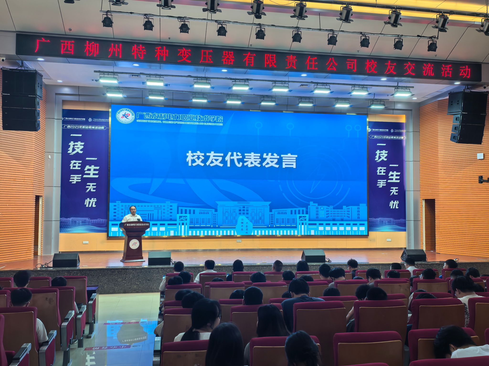潘念萍在致辞时深情回顾了校友们在校的求学时光。她对各位校友在广西柳州特种变压器有限责任公司各岗位上取得的优异表现给予了高度肯定。她表示,学校与企业在人才实训、培养机制、供需对接等方面开展了一系列的深度合作,取得了显著成果,希望校友们常回母校看看,母校永远是校友们的精神家园。