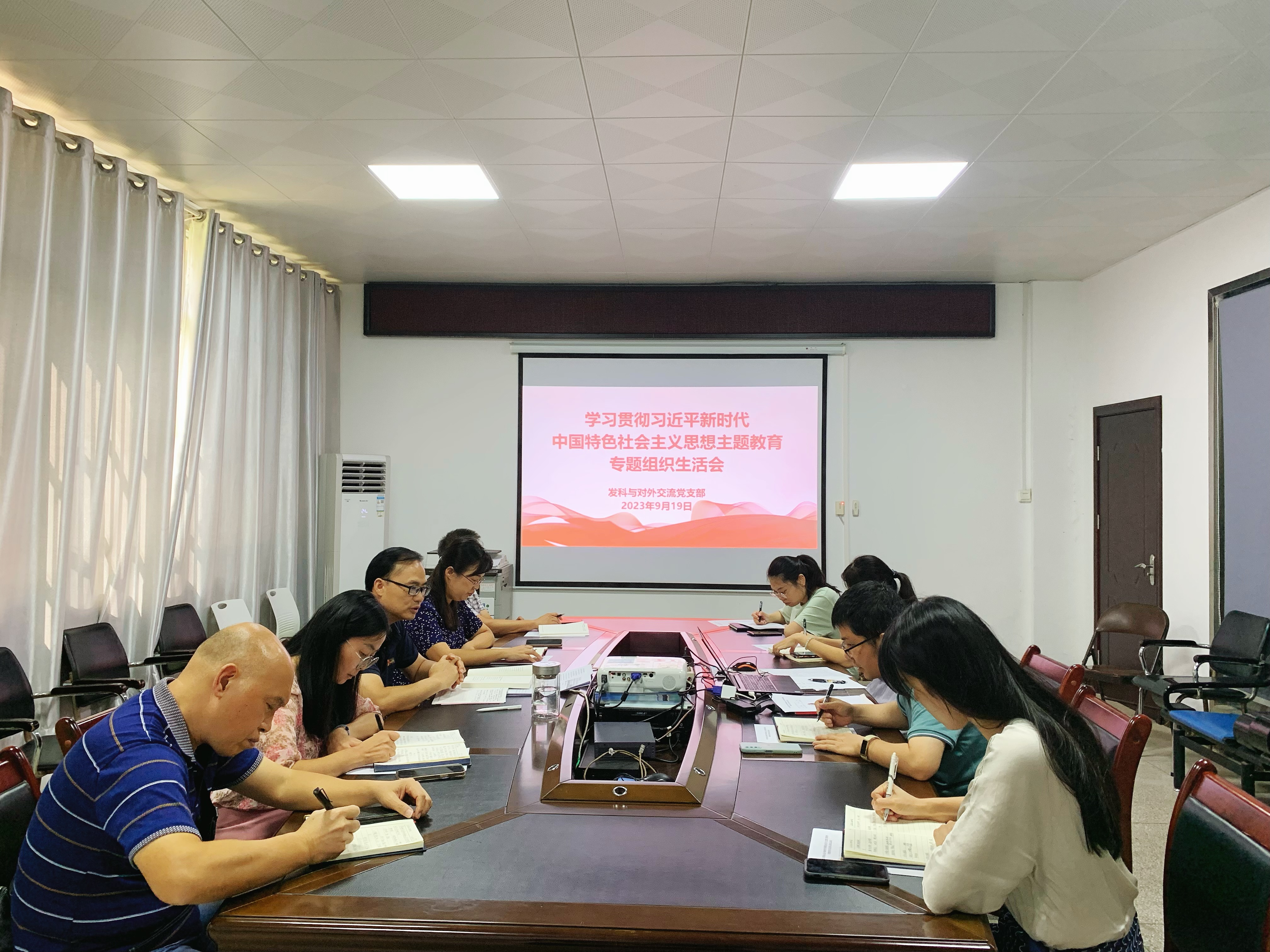 9月19日下午,发科与对外交流党支部召开学习贯彻习近平新时代中国特色社会主义思想主题教育专题组织生活会,会议由支部书记杨鸿锋同志主持,支部全体党员参加会议。
