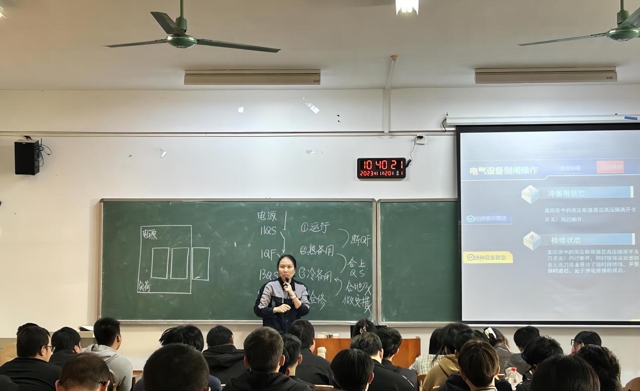 黄老师备课准备充分,资料详实,逻辑清晰,课程架构合理。通过电力事故视频及课前任务引入本节教学内容——规范电力倒闸操作,融入企业标准及“安全意识、细节意识、责任意识和团队意识”思政元素,并结合视频和板书直观地展示了倒闸操作的步骤,向在场师生呈现一堂精彩的电气设备倒闸操作示范课。同时,黄老师充分利用信息化教学手段调动学生学习积极性,使学生的主体地位和教师的主导作用都得到充分体现,课堂学习氛围浓厚。