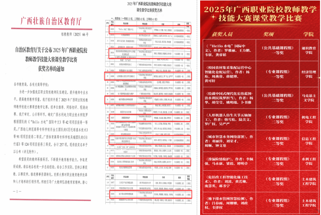 [本网讯]近日,自治区教育厅公布《2025年广西职业院校教师教学技能大赛课堂教学比赛获奖名单》(桂教教师〔2025〕66号)。本届大赛吸引了全区40多所职业院校、200余支教学团队同台竞技。学校参赛教师凭借扎实的教学功底、创新的教学设计和出色的现场表现,共荣获一等奖2项、二等奖5项、三等奖1项,参赛项目全部获奖,整体成绩位居全区前列。