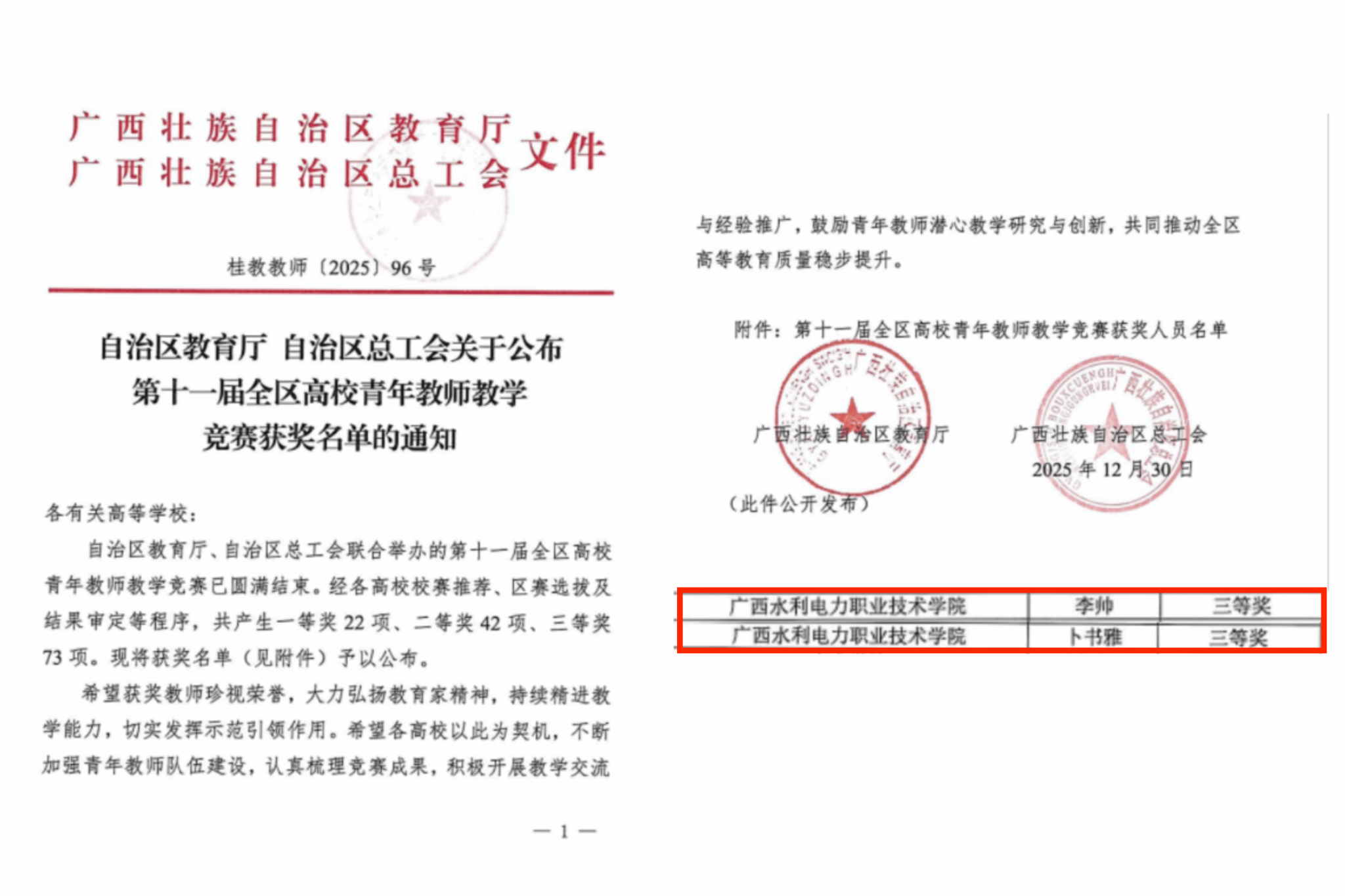 [本网讯]近日,第十一届全区高校青年教师教学竞赛结果正式揭晓。本次竞赛汇聚全区58所高校的137名优秀教师同台竞技,学校自动化工程学院李帅老师、马克思主义学院卜书雅老师凭借扎实的教学功底、创新的教学设计及出色的现场表现,在激烈竞争中脱颖而出,分别荣获工科组和思想政治课专项组三等奖,展现了学校青年教师队伍的教学风采。